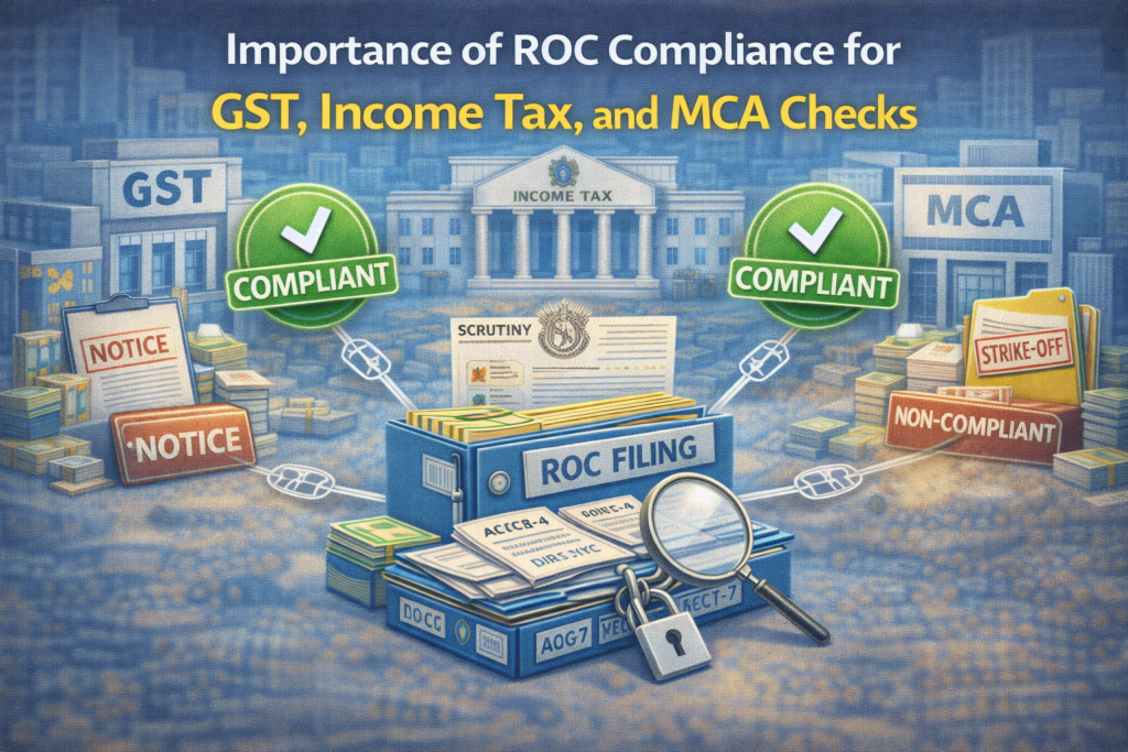 10 Feb Blog Importance of ROC compliance for GST, Income Tax, and MCA checks Posted by Abhishek Gupta February 10, 2026 Introduction Many businesses treat ROC, GST, and Income Tax as separate compliances handled by different people. That thinking is o... Continue reading