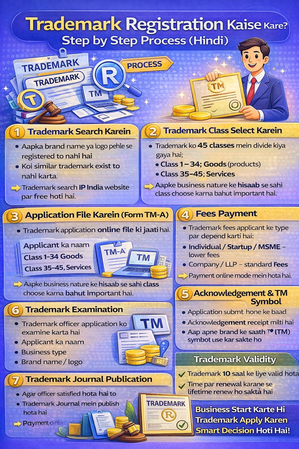 Trademark registration ek one-time effort hai jo aapke business ko long-term protection aur value deta hai. Brand start karte hi trademark apply karna hamesha smart decision hota hai.